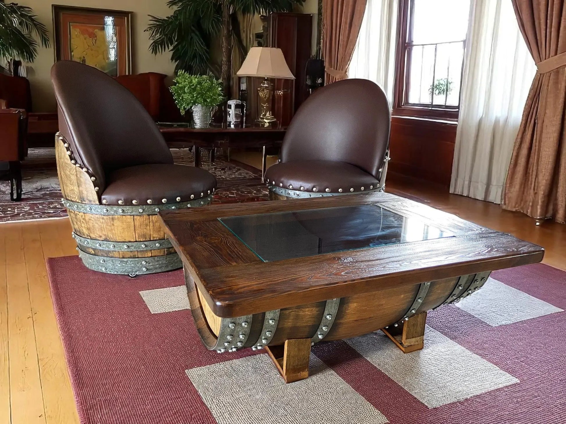 Barrel Coffee Table With Removable Glass Top - Wine/Whiskey/Bourbon Barrel Storage Table - Rustic Furniture