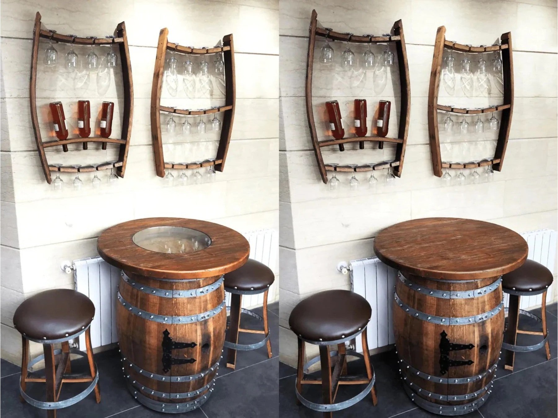 Make your home bar unforgettable. This handcrafted set centers on a spar-varnished oak wine barrel with a round pub-height top, plus two matching stave bar stools and a pair of wall-mounted Trio displays for bottles and stemware. Choose 2 or 4 stools to fit your space.