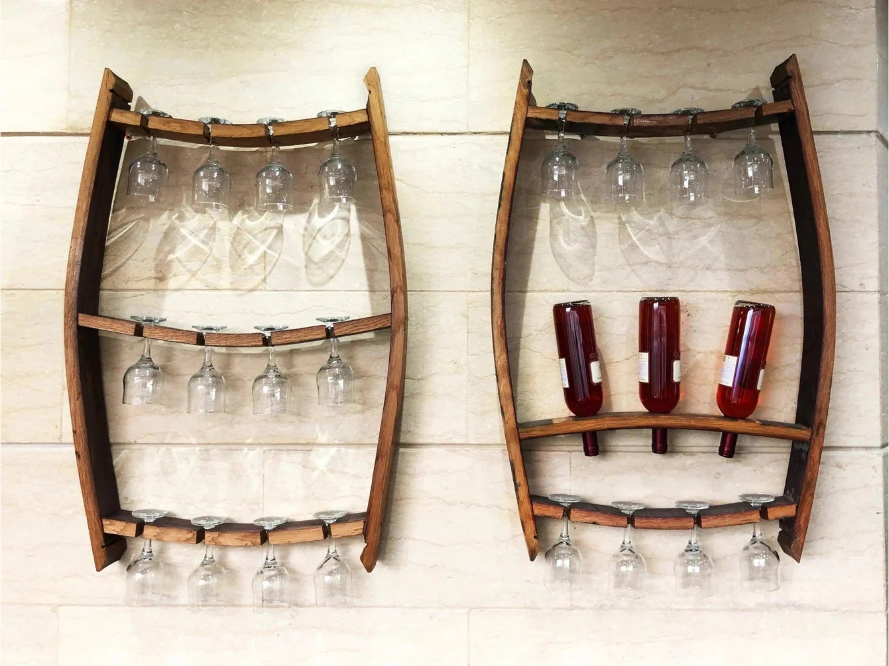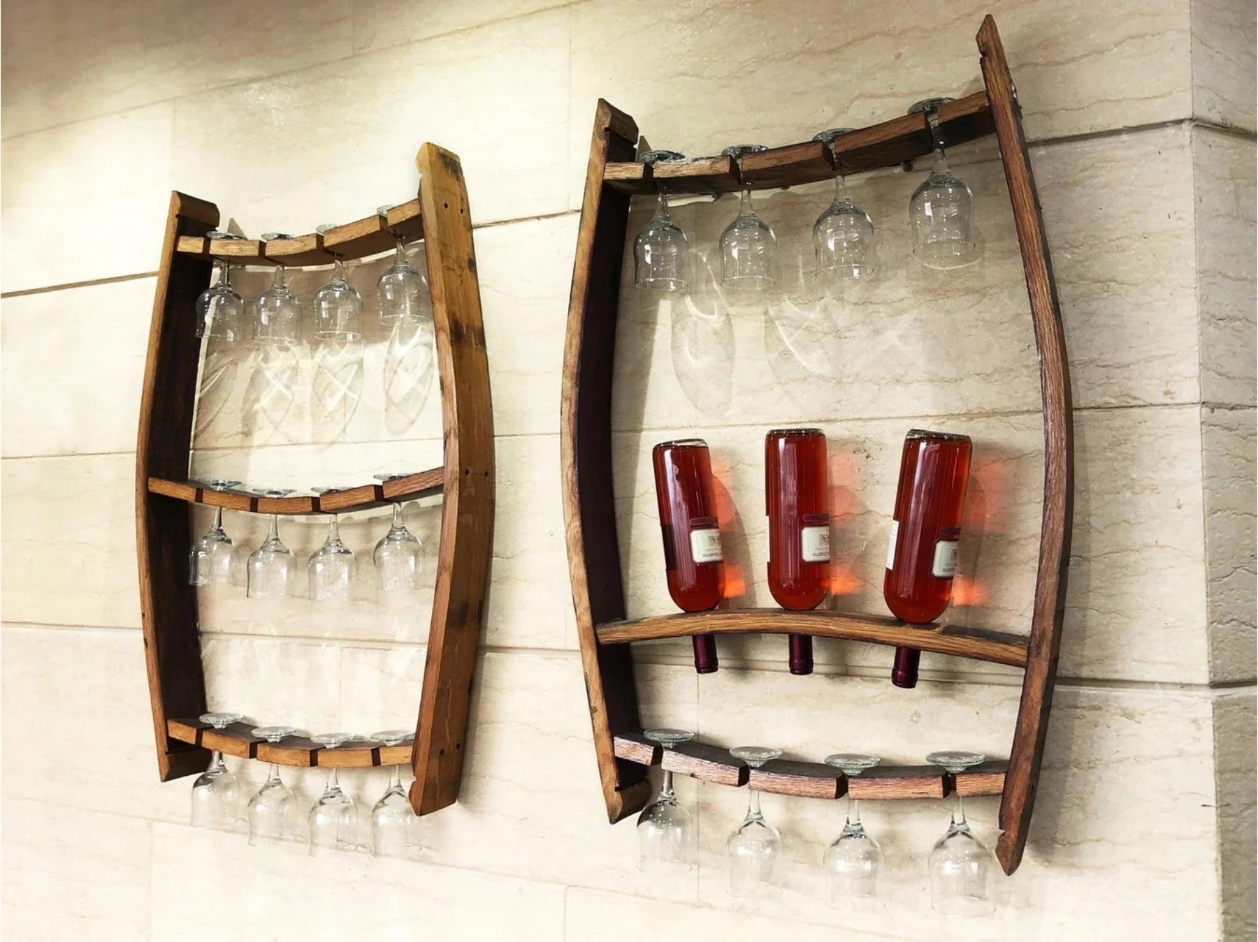 | Trio 1 Wall Display | 1 | Holds 3 bottles + 8 glasses; back hooks installed for easy hanging | 24.8 × 3.5 × 37.2 | ±10%; use wall hooks/anchors; bottles & glasses not included |