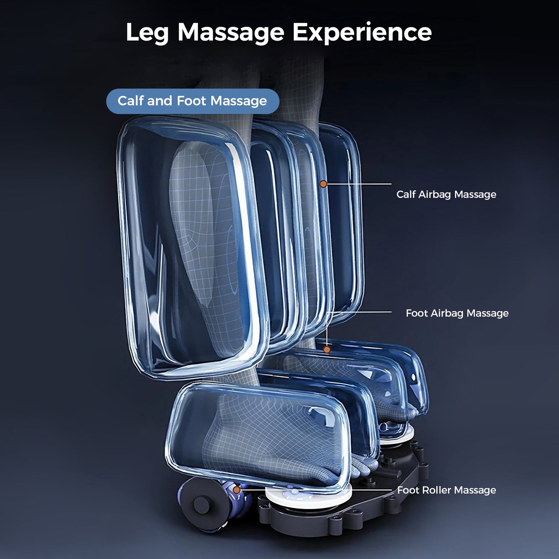 Airbag compression: Cushions target shoulders, arms, waist, hips, calves, and feet.