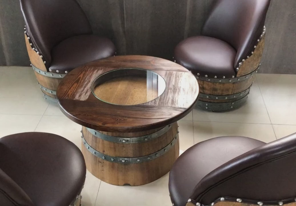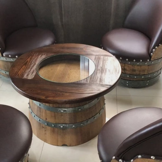 Transform your living space or man cave with this full round wine barrel coffee table set, handcrafted from solid oakand paired with four ultra-comfortable barrel chairs. Rustic, refined, and functional, it’s a true statement set for anyone who loves unique, winery-inspired furniture.